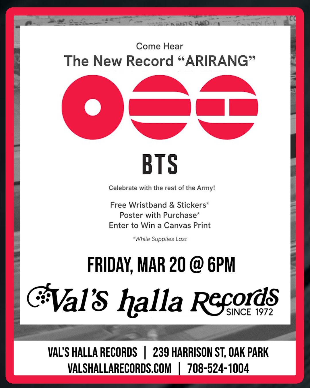 BTS has a new album “ARIRANG” and Val’s halla Records is your place to come celebrate! We will be playing the new album through our concert PA system and raffling off goodies from the record label.